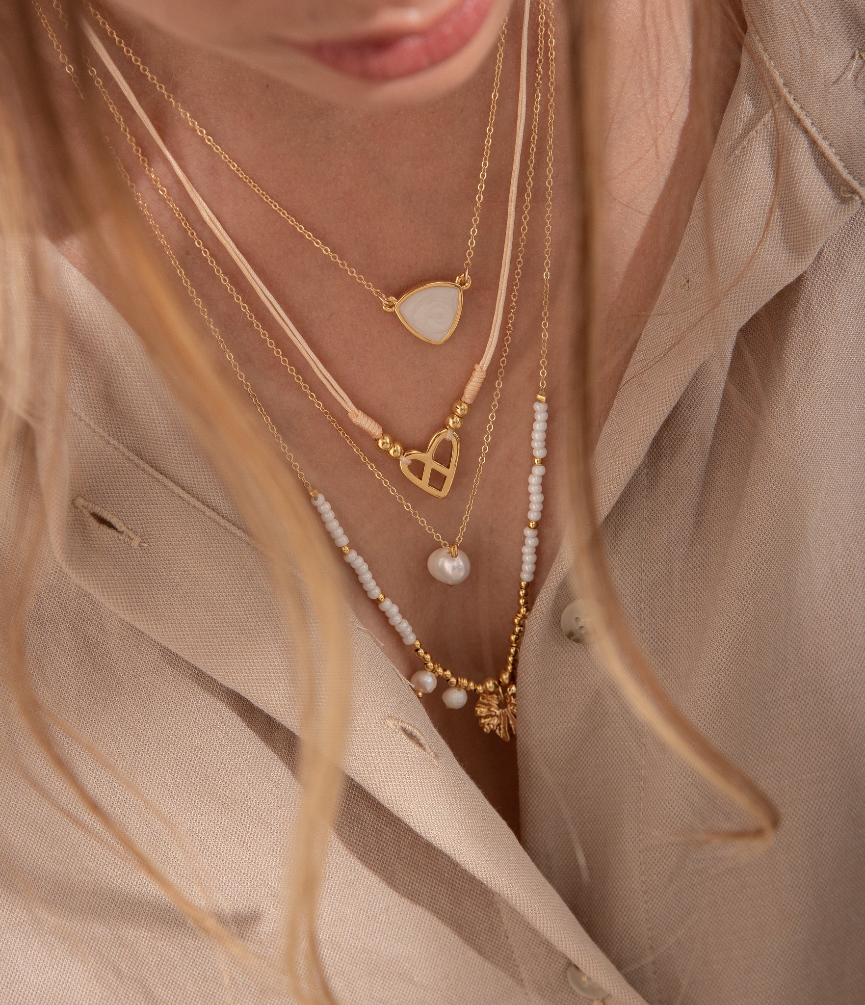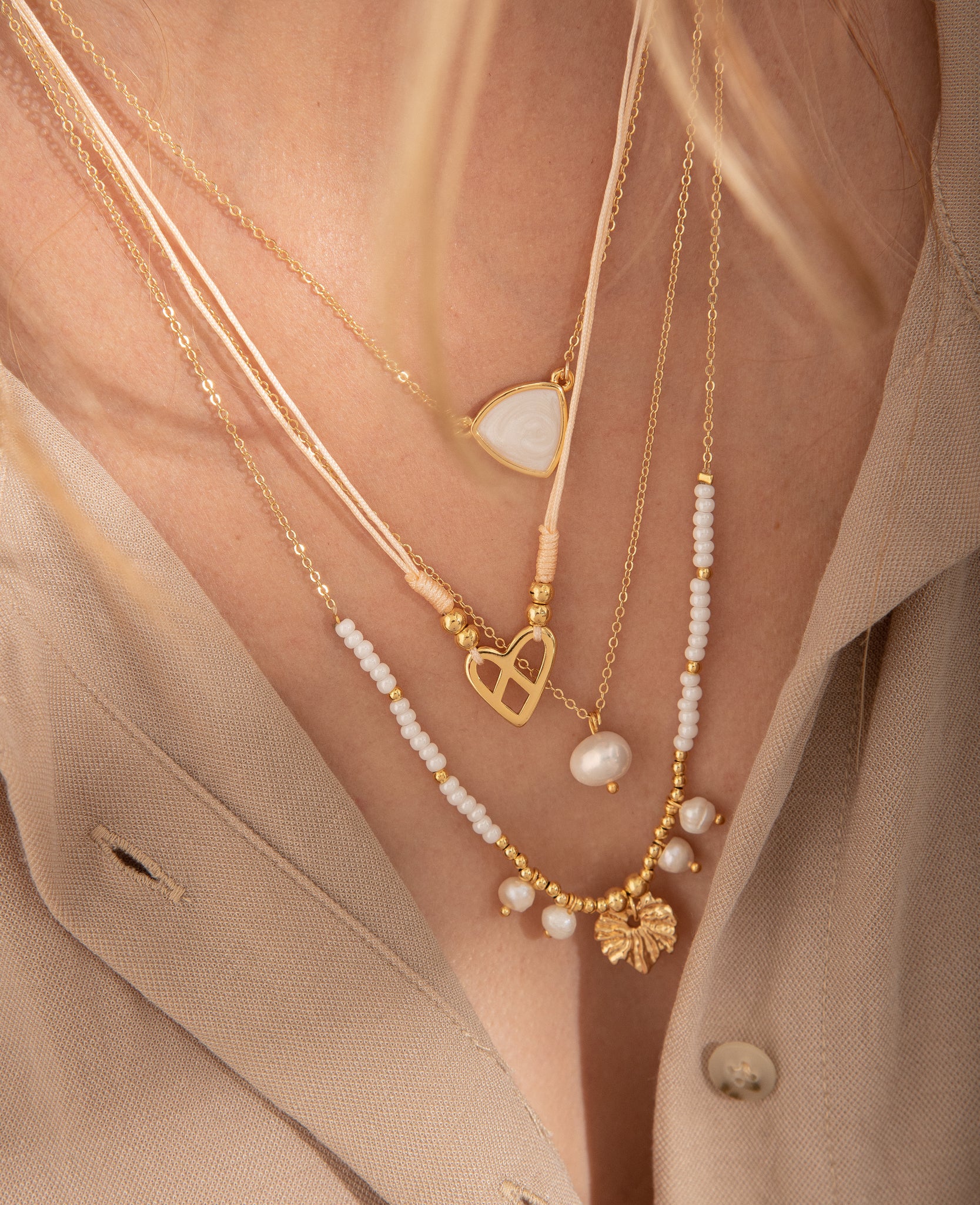 Collar elaborado con cadenas y dijes laminados en oro.Perlas de río. Chaquiras checas. Broche en acero inoxidable.